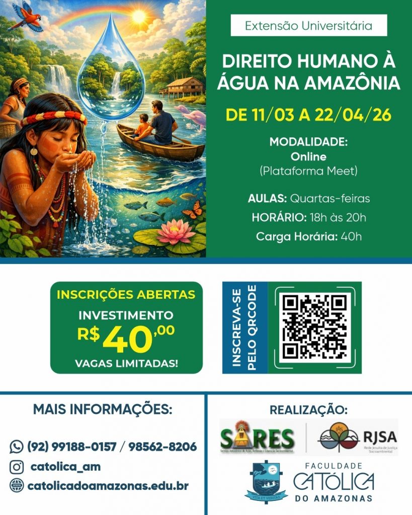 O Serviço Amazônico de Ação, Reflexão e Educação Socioambiental (Sares), em parceria com a Faculdade Católica do Amazonas, realiza o Curso de Extensão Direito Humano à Água na Amazônia. A iniciativa nasce da urgência de fortalecer o compromisso socioambiental com o cuidado da Casa Comum, especialmente em uma região onde a água é fonte de vida, cultura e espiritualidade, mas também marcada por desigualdades e ameaças ambientais.