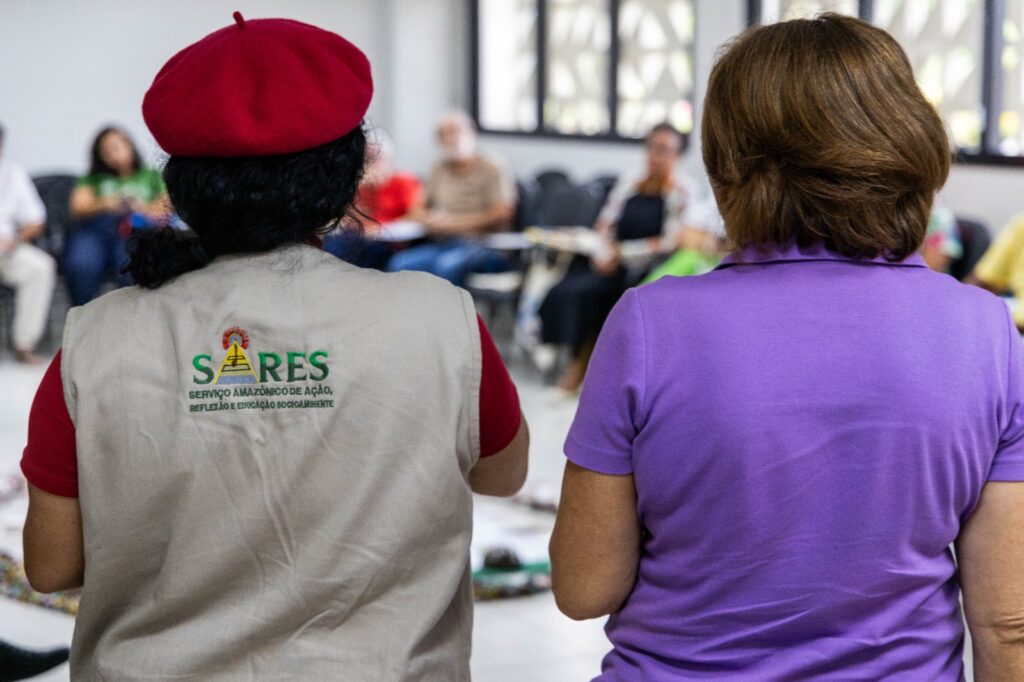A programação iniciou com um momento de acolhida, construção coletiva do espaço educador e mística inspirada nos biomas brasileiros, simbolizando a interligação das lutas socioambientais nos territórios. Durante o encontro também foram formadas as comissões de mística e de elaboração da Carta Política, reafirmando o método participativo do Fórum. O *Sares* integrou a Comissão de Mística e, na programação cultural, apresentou a cartilha Semeadura, elaborada pela Comissão de Ecologia Integral da Arquidiocese de Manaus, da qual a instituição faz parte.